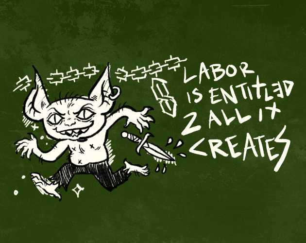 To play this game, you'll need one six-sided die per person, and some art supplies should you wish to make your own gobbo union propaganda! There are two files to download - the digital reads left-to-right, and the print can be folded up as a three-panel pamphlet.